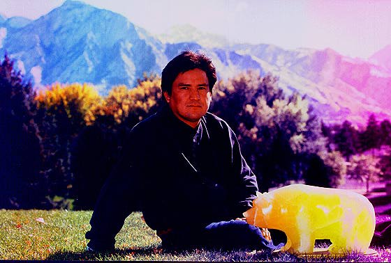 Ronald Gleason, Native American of the Navajo Tribe, with on of his bear scuptures.
